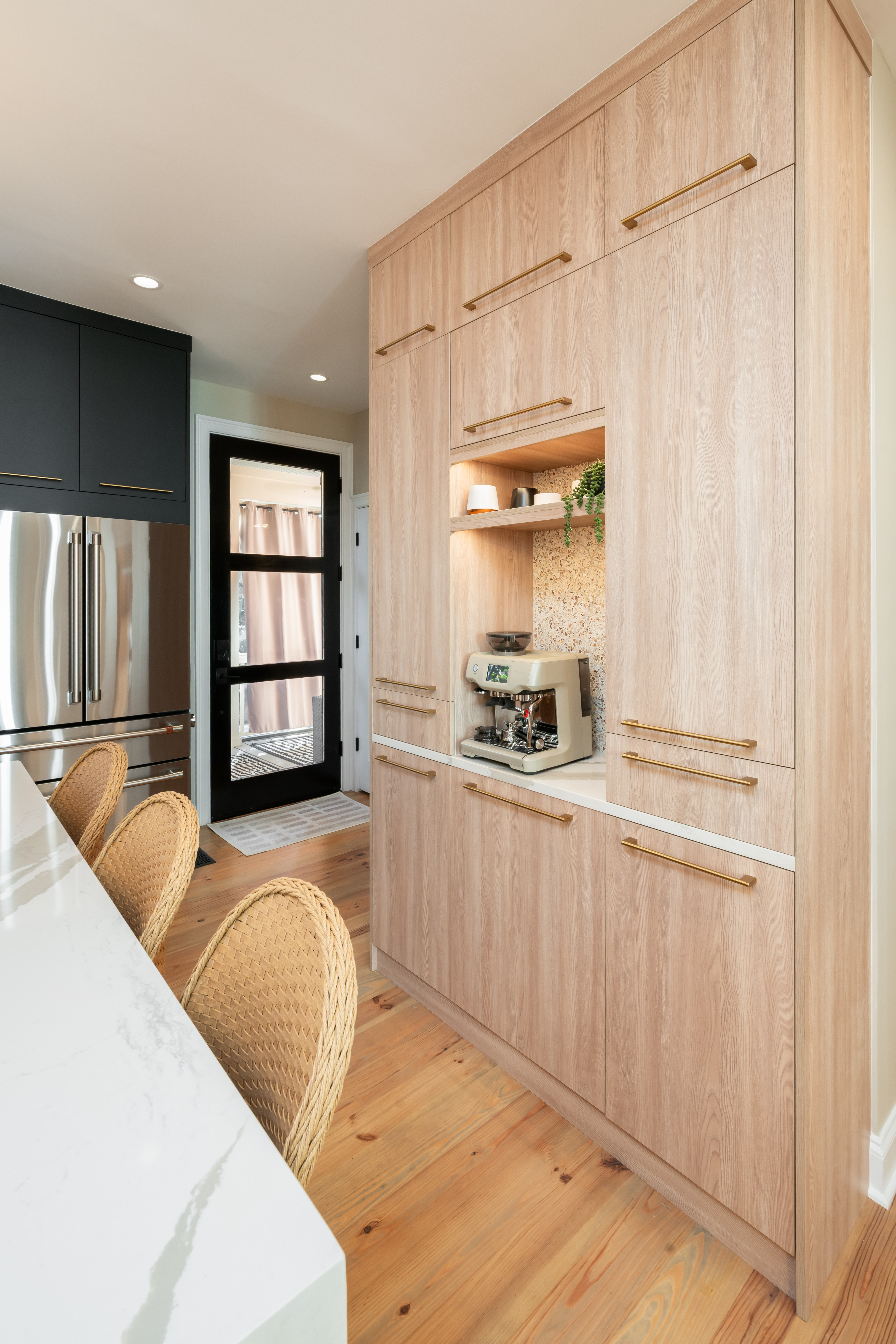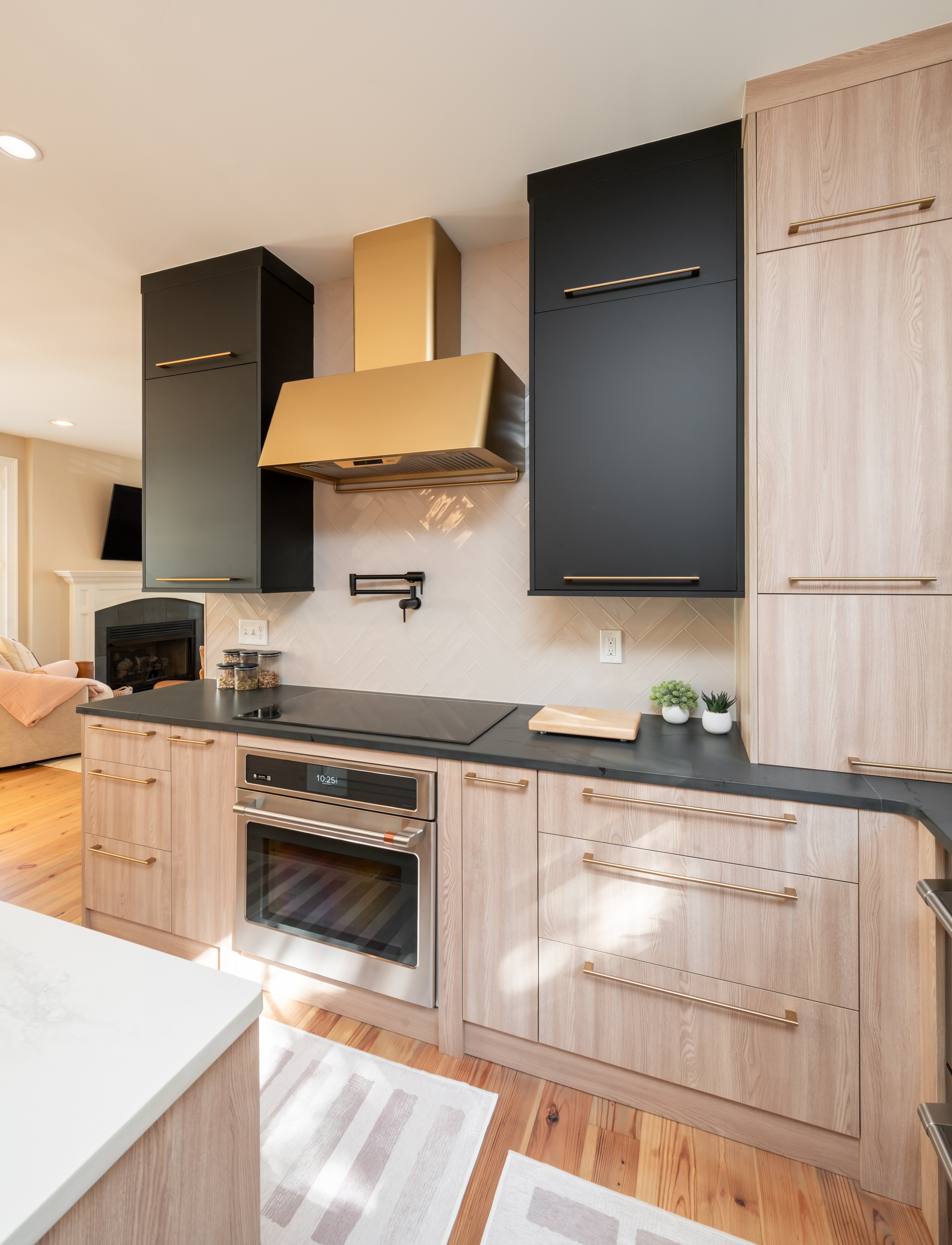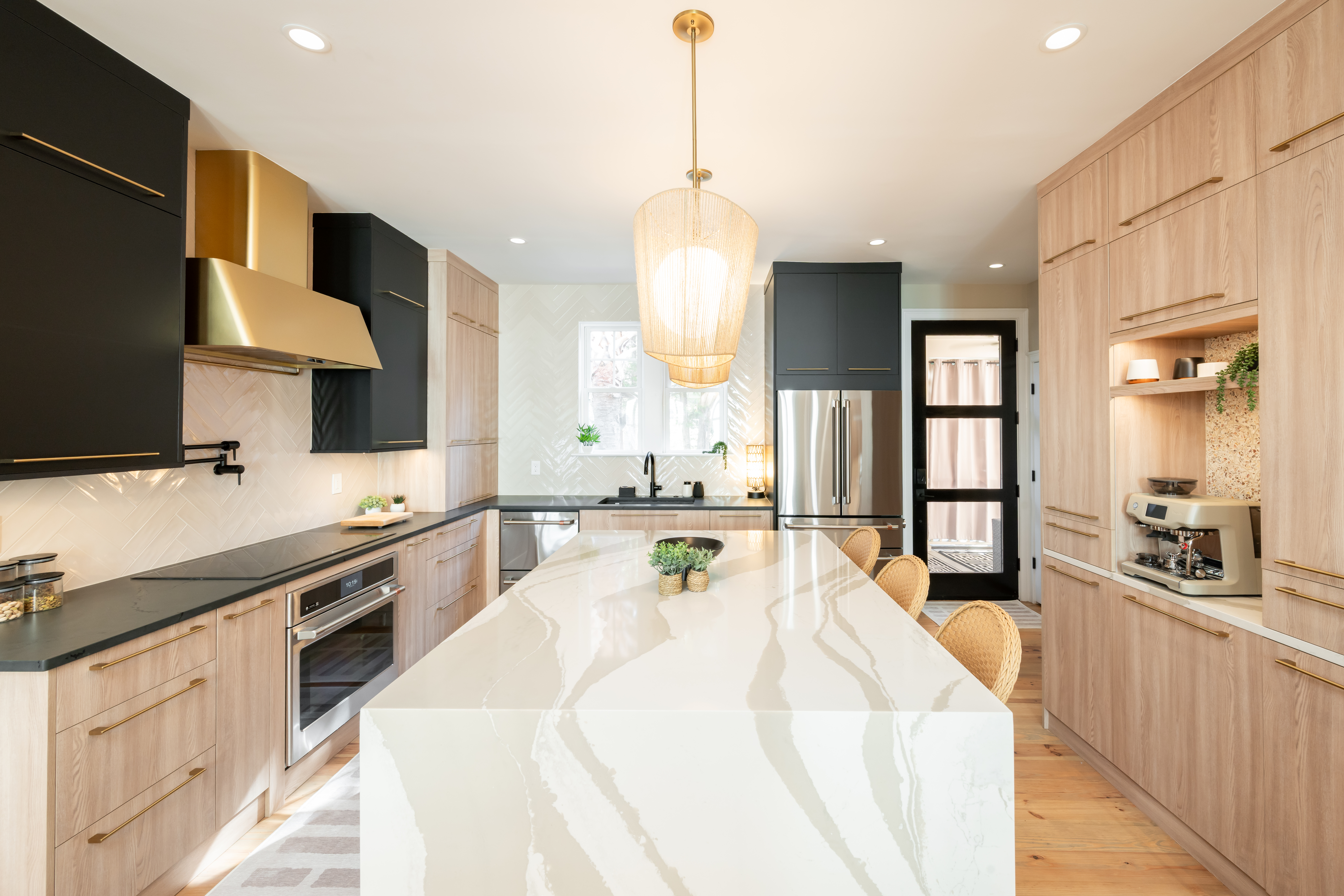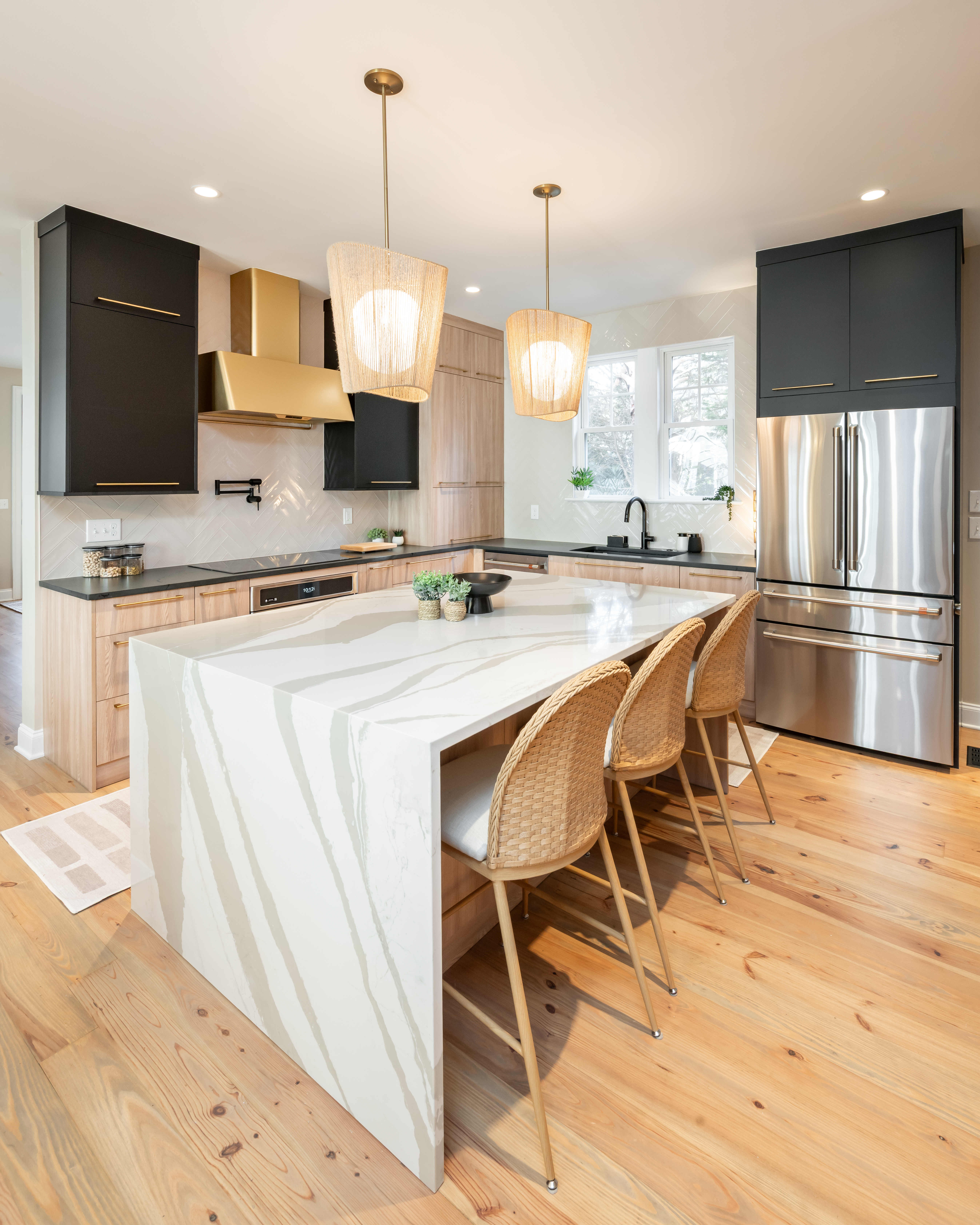 This home on Johns Island had many dated features and a kitchen that felt too closed off before the remodel. To open this space up, the small peninsula island was taken down and replaced with a large waterfall island in Cambria countertops. We took the new Fabuwood cabinetry all the way to the ceiling to give a more elevated look and finished them off with gold hardware. The before and after pictures demonstrate just how easy it is to take what was once dated and turn it into the modern kitchen of your dreams.